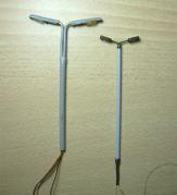 Als Lampen kamen die "Industrieleuchten" der Firma Busch zum Einsatz, die man auf dem Gebiet der DR häufig auf den Bahnsteigen antraf. Zunächst wurden die Widerstände und Dioden abgelötet und die Plastik-Wandhalter entfernt, dann die Kabel durch das Messing-Rohr gezogen. Anschließend erfolgte das Wiederanlöten - diesmal jedoch zur Sicherheit der Widerstand am Pluspol.