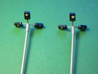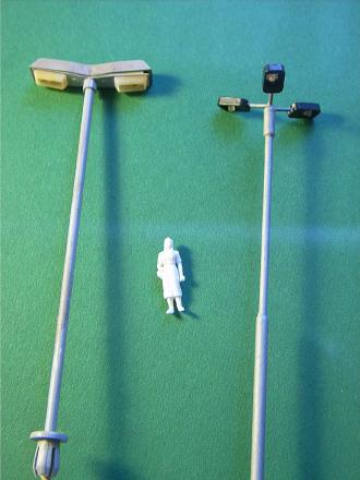 Meinen Vorplatz beleuchteten bisher zwei zweiarmige, moderne Leuchten aus dem handelsüblichen Sortiment. Ich hatte sie auf LED's umgebaut und war damit zufrieden, bis die Entscheidung für die Darstellung der (DDR-)Zeit bis Anfang der 90er Jahre auf der Anlage fiel. Dafür sind die Leuchten zu modern, außerdem im Vergleich zu den Leuten darunter viel zu klobig.