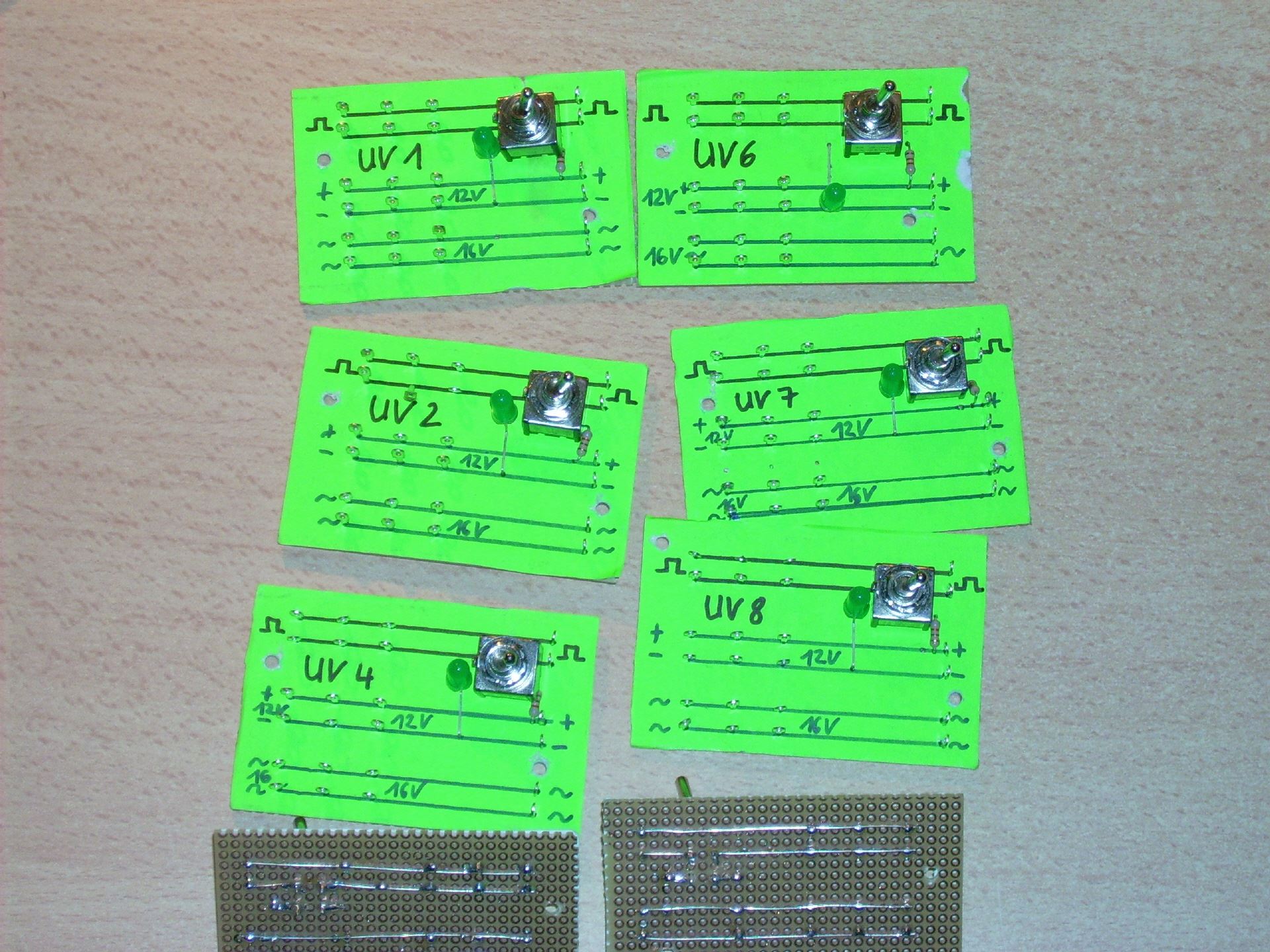 Nun birgt die digitale Ansteuerung immer das Risiko, dass bei einem Kurzschluss "alles steht". Dann kann es schwierig werden, den Kurzschluss zu lokalisieren. Daher habe ich aus Leiterplatten sogenannte "Unterverteiler" gebaut. Auf diesen befinden sich jede Menge Lötösen für alle Potenziale der Ringleitung. Die Lötösen für die Steuerleitung habe ich mittels eines zweipoligen Schalters abschaltbar gemacht. Eine kleine LED zeigt an, ob die Platine ein- oder ausgeschaltet ist.