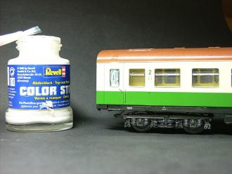 Damit die Pulverfarben insbesondere auf den glatten Flächen besser haften, sollten die Fahrzeuge grundiert werden. Am einfachsten geht das mit einer Grundierung aus der Airbrush-Pistole. Aber auch billiger Haarlack eignet sich - sofern ein unbedingt nötiger Verträglichkeitstest (!) keine negativen Ergebnisse zeigte.