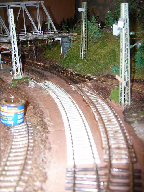 Nun muss erst einmal alles gut durchtrocknen. Anschließend sind die Weichen mit den Stellmotoren zu verbinden, Kabelanschlüsse zu legen, evtl. Trennstellen einzusägen usw. Erst wenn alles funktioniert und wiederum alle Fahrzeuge sicher über diesen Abschnitt fahren, kann das Gleis farblich behandelt werden.
