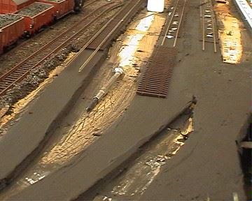 Zunächst werden die alten Gleise entfernt. Waren diese eingeschottert, so wird der entsprechende Abschnitt mit einer Blumenspritze vorsichtig mit Wasser besprüht. (Alle anderen Bereiche abdecken - vor allem elektrische Bauteile !) Nach einer Wartezeit weicht der alte Leim wieder auf - das wird an der weißen Farbe sichtbar.