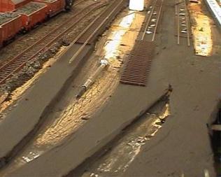 Das gesamte Beton-Schwellenband wird mit Frabe bestrichen und anschließend wieder abgewischt. So verliert es seinen "Plastik-Look". Für alte verwitterte Gleise wäre auch ein Beimischen grüner Farbtöne denkkbar.