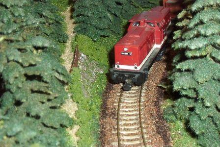 Die Anlagengröße inclusive Schattenbahnhof lässt entsprechende Steigungen zu und auch das Gelände vermittelt den Eindruck einer Bahnlinie im Mittelgebirge.